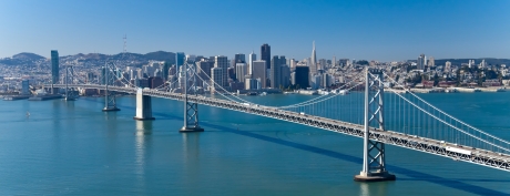 Expansive View of San Francisco Skyline and Bay Bridge Under Clear Blue Skies