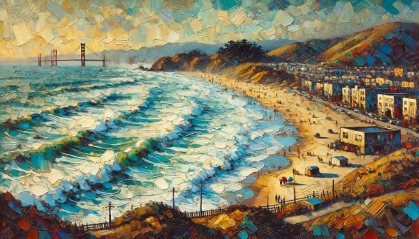 Waves roll vibrantly onto the shore in this stunning portrayal of Ocean Beach, located at the edge of San Francisco. Through a veil of Abstract Expressionism blended with touches of Post-Impressionism, the painting comes alive with dynamic shapes and a vivid palette of blues, whites, and earth tones. The artist skillfully captures the rhythmic pounding of the surf and the quiet buzz of beachgoers engaging in leisure activities. The composition stretches from the sun-drenched sand to the rolling hills and residential areas that line the beach, before reaching the iconic outline of the Golden Gate straddling the horizon. The windswept skies over the scene add a dramatic tone, highlighting the natural beauty and the bustling energy of this beloved coastal area. *** About Ocean Beach: Located in the westernmost part of San Francisco, Ocean Beach spans several miles along the Pacific Ocean and is famous for its expansive views and often brisk weather conditions. It is a favored spot for surfers, picnickers, and tourists alike, though the strong currents and chilly waters make swimming risky. The beach offers scenic views of the sunset beyond the ocean and is adjacent to landmarks such as the Cliff House and Golden Gate Park, making it a crucial part of San Francisco’s coastal experience.