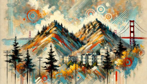 Brushstrokes blur and colors collide in this abstract interpretation of San Francisco's iconic Twin Peaks and the famous Golden Gate Bridge. A harmonious fusion of Impressionism with Abstract Contemporary Art brings a pulsating energy to the canvas, evoking the vibrant hustle of the city amidst a tranquil natural backdrop. Swirls of orange, blue, and grey illustrate a brisk autumn day, while linear elements introduce a modern touch that slices through the softness of the impressionistic style. The juxtaposition of natural terrain with urban architecture invites the viewer to explore the complexity of city life intertwined with nature. Depicted in the foreground, Victorian houses typical of San Francisco stand prominently, offering a hint of human habitation amid vast wildness. This artwork not only captures the essence of a specific locale but also transcends into a universal theme of nature versus urbanization. *** About Twin Peaks and the Golden Gate Bridge: Twin Peaks provides one of the most exquisite vantage points in San Francisco, presenting a panoramic view that can stretch from the Bay Bridge to the Golden Gate Bridge on clear days. The Peaks themselves are second highest in the city, making them a notable landmark alongside the internationally recognized Golden Gate Bridge. Known for its towering red suspension towers and art deco styling, the Golden Gate Bridge was completed in 1937 and has since become an enduring symbol of engineering and beauty. Together, these sites encapsulate the spirit of innovation and scenic beauty that define San Francisco.