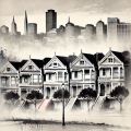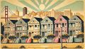 Vintage Illustration of San Francisco's Painted Ladies Under Golden Sunlight