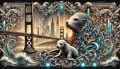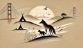 Surreal Depiction of Dumbarton Bridge with Brush Calligraphy and Wildlife