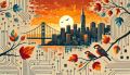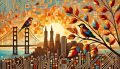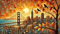 Autumn Embrace: San Francisco Skyline with Cubist Birds and Foliage