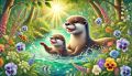 Playful River Otters Bask in a Vibrant Forest Stream Under Sunlight
