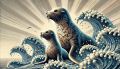 Surreal Aquatic Ballet: Gray Whale and Calf Amidst Watercolor Waves