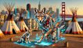 California Sea Lions Emerge from Digital Waves on San Francisco Skyline