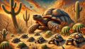 Majestic Desert Tortoise With Hatchlings Amidst Sunset Cacti
