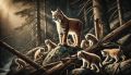 Majestic Bobcat Mother Watches Over Playful Kittens in Forest Clearing