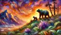 California Grizzly Bear and Cub Amidst a Surreal Sunset Landscape