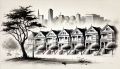Sumi-E Ink Depiction of Painted Ladies with San Francisco Skyline in Fog