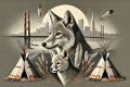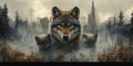 Mystic Encounter: A Wolf and Cubs Against a Foggy Cityscape